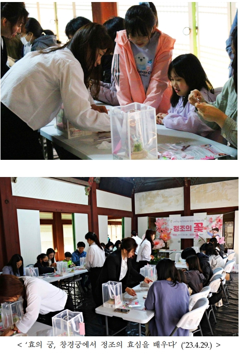 | 창경궁관리소(소장 김미란)는 5월 4일(토) 총 3회에 걸쳐 창경궁 대온실(서울 종로구)에서 정조 임금의 효 사상을 배우고 ‘복숭아꽃 효도등’ 만들기 체험을 할 수 있는 ‘효의 궁, 창경궁에서 정조의 효심을 배우다’(무료, 사전신청)를 운영한다. 초등학생들을 대상으로 무료(입장료 별도)로 진행되며, 4월 25일 오전 9시 창경궁관리소 누리집(royal.cha.go.kr/cgg) 공지사항에 안내되는 신청주소를 통해 총 60명까지 선착순(회당 20명)으로 접수 가능하며, 최종 참여자에게는 4월 30일 개별 문자가 발송된다. 자세한 사항은 창경궁관리소 누리집을 참고하거나, 전화(☎02-2172-0107)로 문의하면 된다. * (1회차) 오후 1:00∼2:40 / (2회차) 오후 2:40∼4:20 / (3회차) 오후 4:20∼6:10