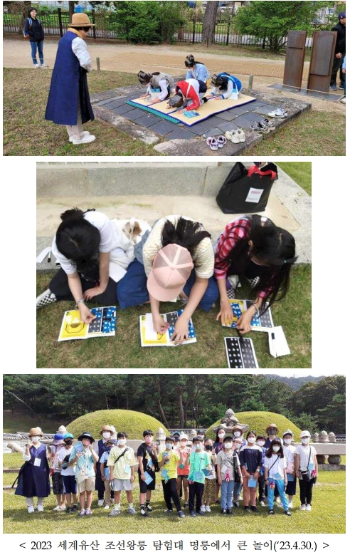 | 조선왕릉동부지구관리소(소장 김용욱)는 5월 6일(10시, 14시), 6월 2일(10시)에 동구릉(경기 구리시)에서 초등학생(4학년∼6학년)을 대상으로 세계유산조선왕릉탐험대 행사 ‘건원릉에서 큰 놀이’(무료, 사전신청)를 진행한다. 조선의 왕이 되어 알릉례를 올리고, 정자각과 비각의 구조를 파악하는 숫자놀이 등을 한 후, 능침에 올라 조선왕릉에 대한 해설을 듣고 왕릉 구조를 파악하는 과제를 완수하면 소정의 기념품을 받을 수 있다.