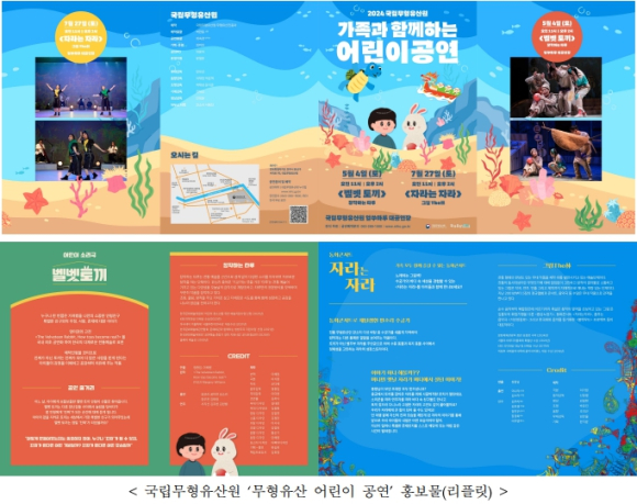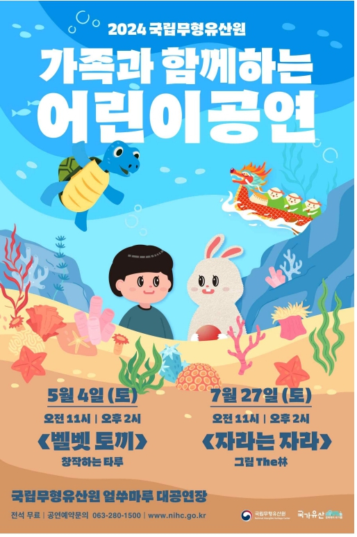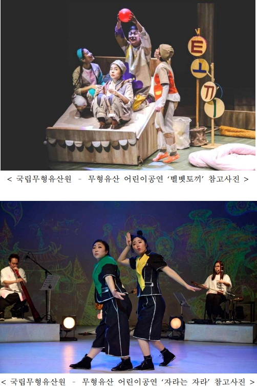 | 국립무형유산원(원장 윤순호)은 오는 5월 4일(토)과 7월 27일(토) 오전 11시, 오후 2시에 국립무형유산원 얼쑤마루 공연장(전북 전주시)에서 온 가족이 함께 감상할 수 있는 무형유산 어린이 공연(무료, 사전신청)을 개최한다. 먼저, ▲ 국악뮤지컬집단 ‘창작하는 타루’가 출연하는 「벨벳토끼」(5.4.)는 애착 토끼인형이 진짜가 되어가면서 나누게 되는 우정·사랑·존재에 관한 이야기로 아이들의 감정을 이해하고 공감하며 아픔을 치유해 주는 작품이다. ▲ 판소리 수궁가를 새롭게 각색하여 원작과는 다른 통쾌한 결말을 보여주는 창작국악그룹 ‘그림(The林)’의 동화콘서트 「자라는 자라」(7.27.)는 수중 동물과 육지 동물 사이에서 정체성을 고민하는 자라의 성장 이야기를 통해 한 편의 노래하는 그림책을 보는듯한 시간을 선사할 것이다. 공연 10일 전부터 국립무형유산원 누리집(www.nihc.go.kr)에서 선착순 예약할 수 있다. 자세한 사항은 국립무형유산원 누리집을 참고하거나 전화(☎063-280-1500, 1501)로 문의하면 된다.
