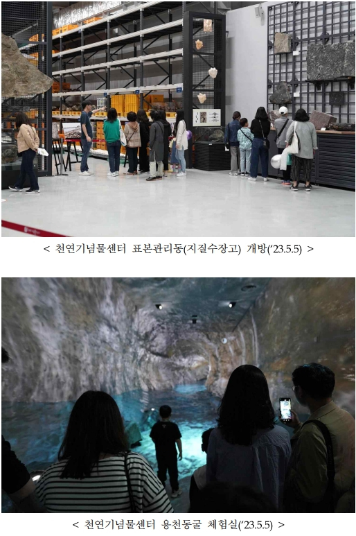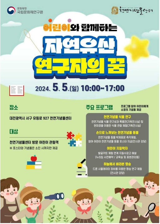 | 국립문화재연구원(원장 김연수)은 5월 5일(일) 오전 10시부터 오후 5시까지 천연기념물센터(대전 서구)에서 ‘어린이와 함께하는 자연유산 연구자의 꿈’(무료, 현장·사전신청)을 개최한다. ▲ 내부가 보이지 않는 체험상자 속 천연기념물 동물 박제표본을 만져보고 맞추면 동물 포스터를 제공하는 <손으로 느껴보는 천연기념물 동물>, ▲ 노거수(크고 오래된 나무)의 3차원 사진, 영상 등으로 구성된 천연기념물 식물 연구 성과 특별전을 감상하고, 봄꽃 표본을 현미경으로 관찰해보는 <천연기념물 봄꽃을 아시나요?>, ▲ 친환경 공룡뼈 발굴 교구재 체험과 지질수장고 연계 해설 프로그램에 참여할 수 있는 <어린이 지질학자>, ▲ 드론 모의실험장치를 이용해 가상으로 드론 체험을 경험해 보는 <하늘에서 바라본 명승>으로 구성된다. 이와 함께, 표본관리동(지질수장고)도 하루 동안 개방(총 8회 / 40분 개방, 20분 정비)한다. 당일 천연기념물센터를 방문한 어린이들은 무료로 참여가 가능하다. 단, 사전접수로 진행되는 <어린이 지질학자>의 경우, 29일 오전 10시부터 천연기념물센터 누리집(https://nrich.go.kr/nhc/index.do)을 통해 선착순으로 예약할 수 있다.