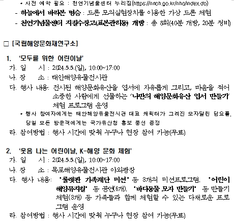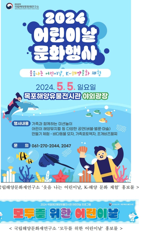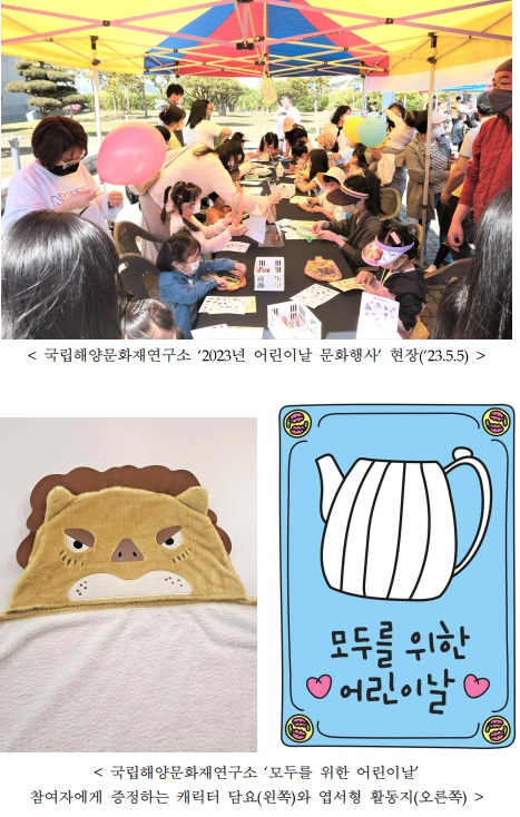 | 국립해양문화재연구소(소장 김성배)는 5월 5일(일) 태안해양유물전시관 내 전시된 해양문화유산을 엽서에 자유롭게 그리고, 마음을 적어 소중한 사람에게 선물하는 ‘모두를 위한 어린이날’(오전 10시~오후 5시, 태안해양유물전시관 / 무료, 현장접수)과 임무(미션) 수행 프로그램, ‘어린이 해양뮤지컬’ 등 공연, ‘바다동물 모자’ 등 만들기 체험으로 다채롭게 구성된 ‘웃음 나는 어린이날, K-해양 문화 체험’ 행사(오전 10시~오후 5시, 목포해양유물전시관 야외광장 / 무료, 현장접수)를 개최한다. ‘모두를 위한 어린이날’ 참여자에게는 태안해양유물전시관 대표 캐릭터가 그려진 모자달린 담요를 증정하며, 당일 모든 방문객에게는 다가오는 국가유산청 출범(5.17.)을 기념하는 홍보 풍선도 나눠준다. 각 행사에 대한 자세한 내용은 국립해양문화재연구소 누리집(www.seamuse.go.kr)에서 확인할 수 있다.