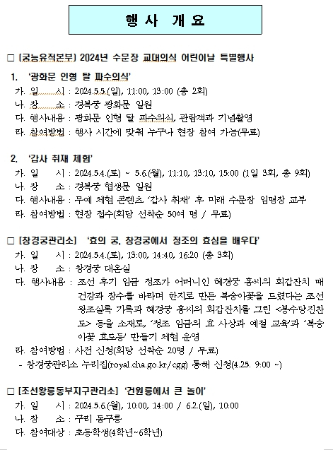 먼저, 궁능유적본부는 5월 5일(일) 4대궁과 종묘, 조선왕릉, 세종대왕릉을 방문하는 만 12세 이하의 어린이의 동반 보호자 2인에 대하여 내·외국인에 관계없이 무료관람을 실시한다. (어린이는 상시 무료) 또한, 한국문화재재단(이사장 최영창)과 함께 5월 4일에서 6일까지 3일간 경복궁 광화문 및 협생문 일대(서울 종로구)에서 수문장 캐릭터 인형의 명령에 맞춰서 진행되는 ▲ ‘광화문 인형 탈 파수의식’(5.5. 오전 11시, 오후 1시)과 갑사(甲士)가 선발되는 과정인 취재(取才)를 체험해 볼 수 있는 ▲ ‘갑사 취재 체험’(5.4.~5.6. 오전 11시 10분, 오후 1시 10분, 오후 3시)으로 구성된 ‘2024년 수문장 교대의식 어린이날 특별행사’(무료, 현장접수)를 개최한다.