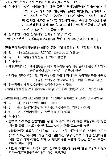 문화재청(청장 최응천)은 자라나는 꿈나무인 어린이들이 가족들과 함께 우리의 국가유산을 재미있고 친숙하게 접할 수 있도록 다양한 국가유산 활용 행사를 운영한다.