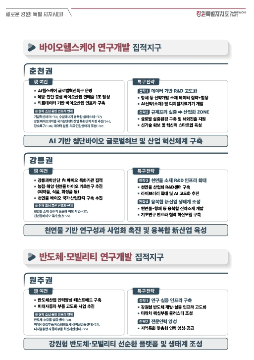 | 「강원연구개발특구(안)」 주요내용 춘천-강릉「바이오헬스케어 연구개발 집적지구」 - 춘천은 바이오의약품 및 체외진단, 디지털치료기기 등 연구개발 고도화 및 산업화에 강점이 있고, 강릉은 과학산업단지 내 집적된 연구기관을 활용한 천연물 소재 기초연구에 강점이 있다. → 디지털 기반, 융복합 바이오‧헬스 산업의 메카로 육성 원주「반도체‧모빌리티 연구개발 집적지구」 - 원주에서 수도권 반도체 메가 클러스터 확장에 대비 중이며, 현재 조성 중인 반도체 개발‧실증 인프라와 연계하여 연구개발이 가능한 강점이 있다. → 차세대 반도체 및 소부장 연구 클러스터를 조성 향후, 도에서는 구체적이고 세분화된 특구종합계획(안)을 수립하여 주민공람 및 공청회 등을 거쳐 과학기술정보통신부에 특구 지정을 신청하고, 관계부처 협의 및 연구개발특구위원회 심의 등을 거쳐 연구개발특구로 지정받겠다는 계획이다. 김진태 강원특별자치도지사는 “그동안 연구개발특구는 관련법에 지정요건을 충족하지 못해 우리에게는 그림의 떡과 같은 제도였지만, 강원특별법을 통해 춘천, 원주, 강릉 세 개 도시가 연합해서 도전 할 수 있게 되었다” 면서, “오늘 발표로 바로 신청할 수 있는 것이 아니라 앞으로 종합계획수립부터 타당성 조사, 공청회, 심의위원회 등 준비해야 할 것이 많다”며, “기본구상 전략을 바탕으로 꼼꼼하게 준비해 25년 1월 정식 지정 요청을 할 계획”임을 밝혔다. |