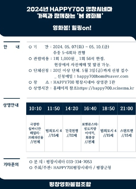 평창군, 2024년 가족과 함께 즐기는 봄영화제 개최「포켓몬스터: 성도지방 이야기, 최종장」부터「범죄도시4」까지 총 5개의 영화상영한용택 기자 / |