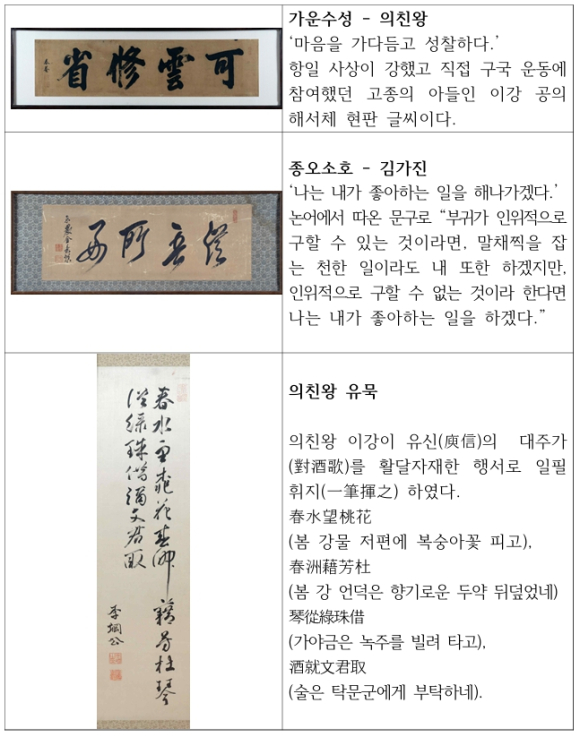 | 중요 전시 유물로는 고종의 다섯째 아들인 의친왕(義親王)이 작성한 ‘가운수성(可雲修省, 마음을 가다듬고 성찰하다)’, 조선 말기의 외교관 ‘김가진(金嘉鎭)이 작성한 종오소호(從吾所好, 나는 내가 좋아하는 일을 해나가겠다)’ 등을 비롯해 잘 알려지지 않은 독립운동가들의 유묵과 윤봉길의 초상화 등이 전시된다. * 춘암(春菴) 이강(李堈)은 조선 고종의 다섯째 아들로, 독립운동에 헌신함. * 김가진: 독립운동가이자 서예가이기도 하며, 호는 동농(東農)임.
