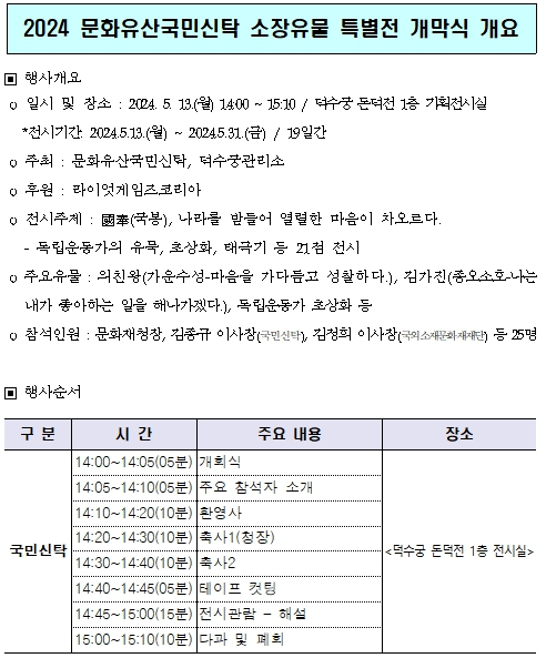 문화재청(청장 최응천)은 문화유산국민신탁(이사장 김종규)과 5월 13일(월)부터 5월 31일(금)까지 덕수궁 돈덕전(서울 중구) 1층 기획전시실에서 문화유산국민신탁이 세계적 온라인 게임 개발 및 서비스사 ‘라이엇게임즈’의 후원 등을 통해 그간 수집한 독립운동가의 유묵과 초상화 등 총 21점의 유물을 공개하는 특별전 ‘국봉(國奉) - 나라를 받들어 열렬한 마음이 차오르다.’를 운영하며, 5월 13일(월) 오후 2시에 개막식을 개최한다. * 운영 시간: 9:00~17:30 (입장마감 17:00), 월요일 휴관 * 덕수궁 입장료는 별도이며, 덕수궁 입장 시 특별전 관람은 무료 * 유묵: 생전에 남긴 글씨나 그림