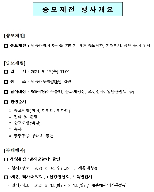 성군 세종대왕 탄신 627돌 기념 ‘숭모제전’ 거행- 15일 세종대왕릉 및 효종대왕릉 무료개방… 무형유산 공연과 ‘삼강행실도’ 특별전도 운영정호 기자 / |