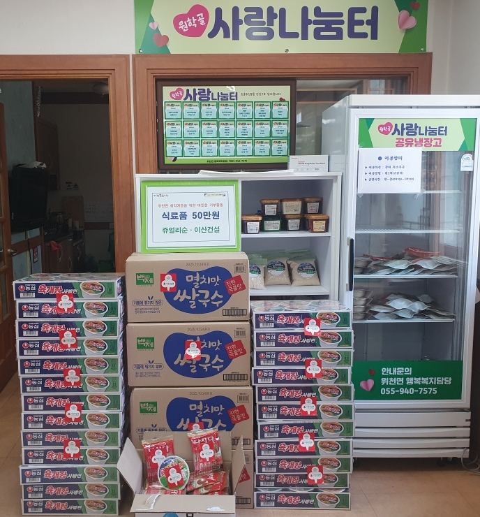 쥬얼리순·이산건설, 고향사랑 위천면에 후원품 기탁쌀국수, 육개장 사발면, 간장, 멸치다시마 등 식료품 세트를 후원김도형 기자 / |