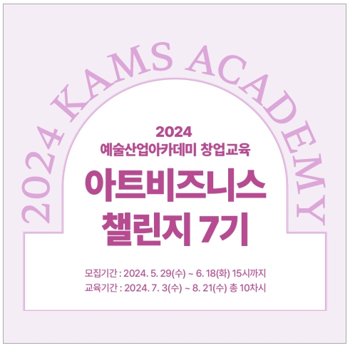 | 아트비즈니스챌린지 7기 수강신청은 6월 18일(화) 오후 3시까지 온라인을 통해 접수 가능하며, 자세한 사항은 예술산업아카데미 누리집 아트모아(https://artmore.kr)에서 확인할 수 있다.