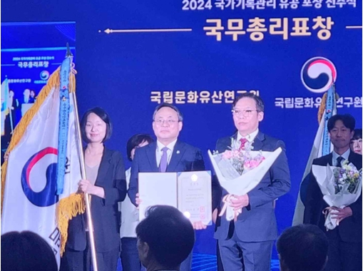 국가유산청 국립문화유산연구원(원장 김연수, 이하 ‘연구원’)은 행정안전부 국가기록원 주관 2023년 기록관리 기관평가에서 우수기관으로 선정되어, 지난 4일 ‘2024년 기록의 날’ 기념식이 열린 정부세종컨벤션센터에서 국무총리 표창을 수상했다. 기록관리 평가는 공공기관의 기록관리 역량 강화 및 개선유도를 위해 2007년부터 실시하고 있으며, 연구원은 2014년 기록관을 개관한 이래로, 2022년 기록관리 우수기관으로 선정되어 행정안전부장관상을 수상한 데 이어, 올해에는 국무총리 표창을 수상하며 두 번째로 우수기관으로 선정되는 쾌거를 이루었다.