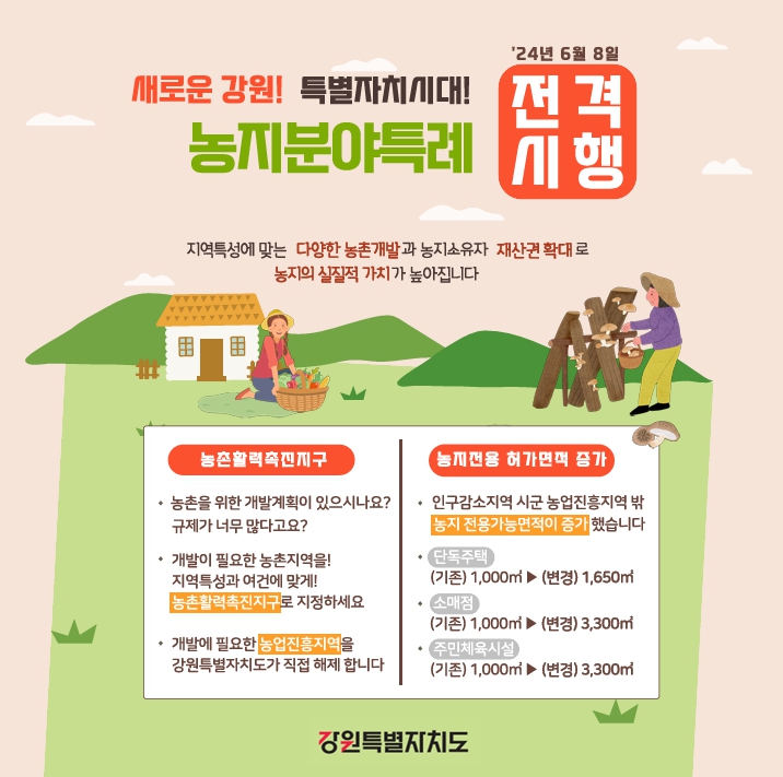 지난해 강원특별법 2차 개정에 반영된 농지특례가 위임 조례와 하위규정 제정 등 사전준비를 마치고 6월 8일 본격 시행된다.