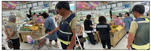 | □ 대화면지역사회보장협의체, 이웃과 함께하는 장보기 진행 ੦ 어제(6.12.) 10:00, 대화면지역사회보장협의체(위원장 박용호, 김상수) 위원 3명은 대화면 해동할인마트에서 복지사각지대 취약계층 주민과 함께 장보기 행사를 진행하였음. ੦ 본 행사는 복지사각지대 가구와 지역사회보장협의체 위원을 매칭해 필요한 생활용품 및 식료품을 같이 구매하고 지원하는 사업으로 6월 내 10가구를 대상으로 지속 추진할 예정임.