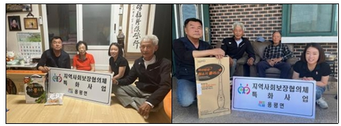 | □ 진부면 ㈜미광전기, 성금 10만원 기탁 ੦ 어제(6.12.), ㈜미광전기(대표 박상균)는 관내 어려운 이웃을 위한 성금 10만원을 진부면사무소에 기탁하였음. □ 용평면지역사회보장협의체, 맞춤형 안부꾸러미 전달 ੦ 어제(6.12.) 15:00, 용평면지역사회보장협의체(위원장 김남호, 정진용)는 “똑똑똑! 안부확인 지원사업” 대상자로 선정된 복지사각지대 및 저소득층 5가구를 방문하여 안부를 확인하고 가구별 필요한 맞춤형 안부꾸러미를 전달하였음.