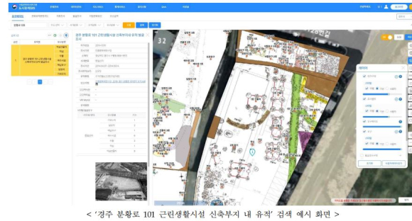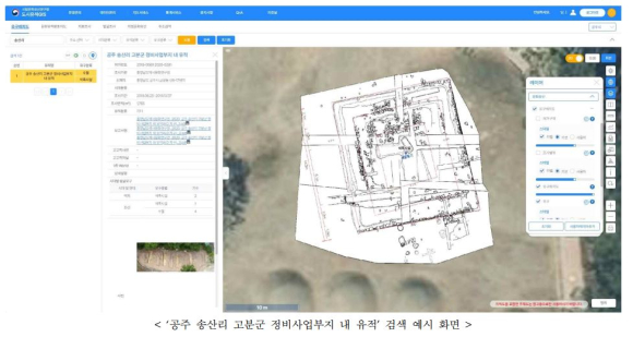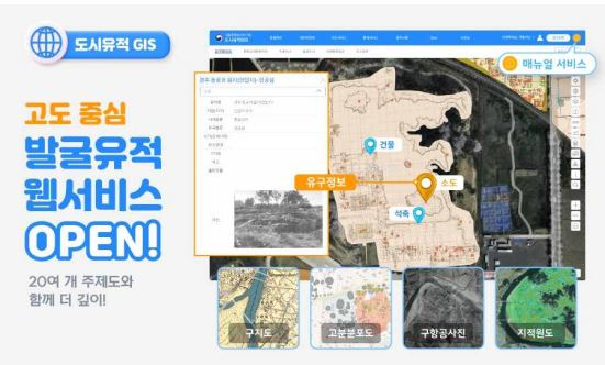 ‘도시유적 GIS’는 디지털 지도상에 4대 고도(古都, 경주·부여·공주·익산)를 중심으로 발굴된 2,243건의 유적과 27,385건의 유구에 대한 상세정보를 비롯해 일제강점기 지형도·지적원도, 구(舊) 항공사진, 고분 분포도 등을 한 곳에 모아 제공하는 온라인 시스템이다. 조사자들이 현장조사 때마다 국토교통부, 국가기록원 등에서 별도로 제공하는 정보를 수집·분석하는 데 2~3일 걸리던 기존 소요 기간이 이 통합 시스템을 이용하면 30분 이내로 줄어들 수 있다. * 고도(古都): 과거 우리 민족의 정치 · 문화의 중심지로서 역사상 중요한 의미를 지닌 경주 · 부여 · 공주 · 익산과 그 밖에 고도 지정절차를 거쳐 정하는 지역