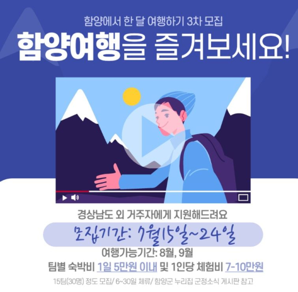 함양군, ‘함양에서 한 달 여해하기’ 3차 참여자 절찬 모집 중장기 체류 여행 후 개인 누리소통망 홍보, 7월 24일까지 접수정호 기자 / |