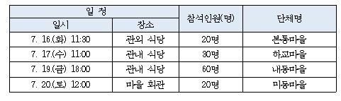 2. 초복 맞이 마을별 주민화합 행사 〇 초복을 맞아 수동면 관내 마을은 20일(토)까지 마을별로 초복맞이 주민화합 행사를 개최하고 있음. 〇 초복맞이 마을 공동 점심식사는 각 마을회 및 경·노모회에서 준비하였으며, 주민들은 점심을 함께하며 건강한 여름을 지낼 수 있도록 서로 기원하고 덕담을 나누는 시간을 가질 예정임.