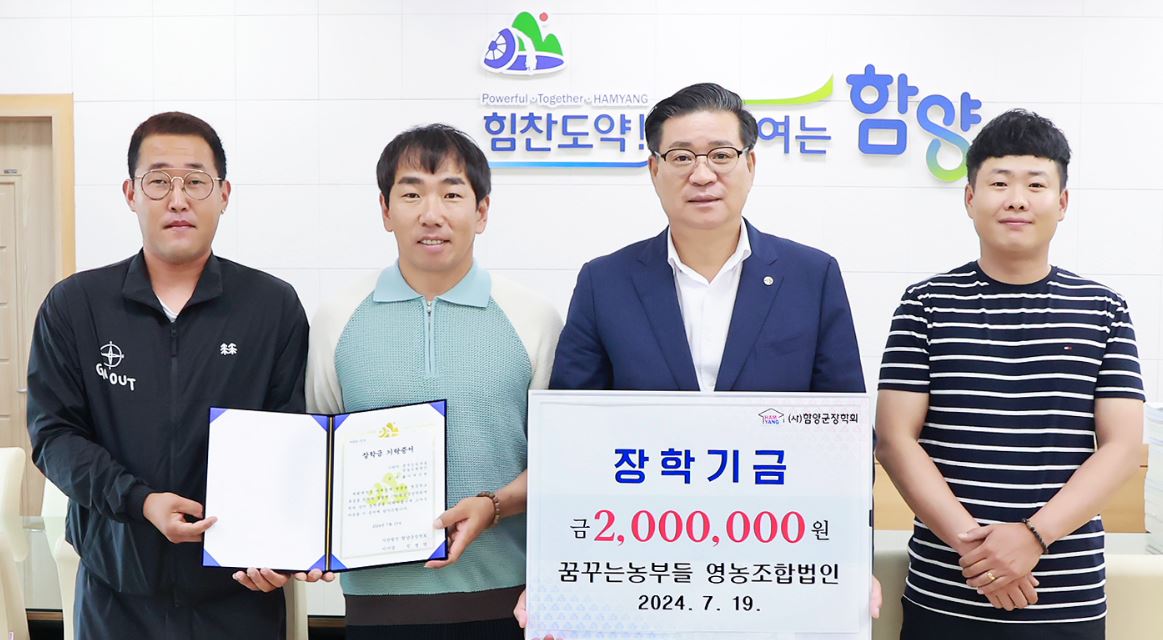 함양군, 미래인재 육성을 지원하는 장학금 기탁 연이어후계농업경영인회 함양군연합회 100만 원, ㈜석암종합건설 300만 원,꿈꾸는농부들 영농조합법인 200만 원 한용택 기자 / |