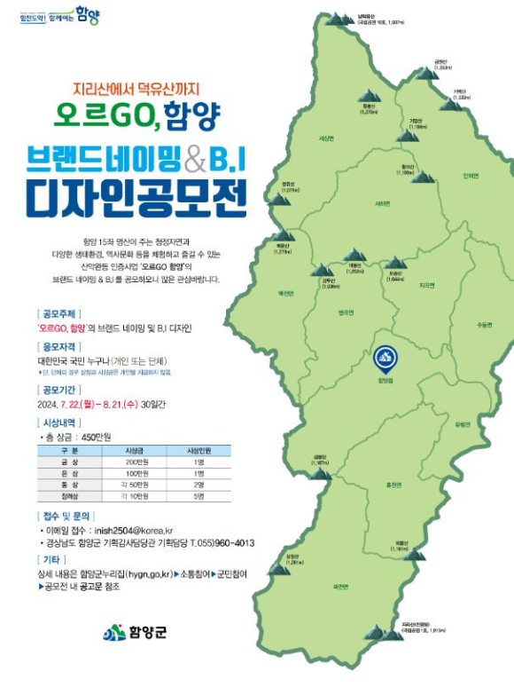 국민 누구나 참여할 수 있는 이번 공모전은 ‘오르GO, 함양’의 브랜드 네이밍과 이미지(BI·브랜드 아이덴티티) 및 응용 디자인 등을 공모하며, 모두 9점을 선정할 예정으로 금상 1점 200만 원, 은상 1점 100만 원, 동상 2점 각 50만 원, 장려상 5점 각 10만 원 등 총상금 450만 원 규모이다.