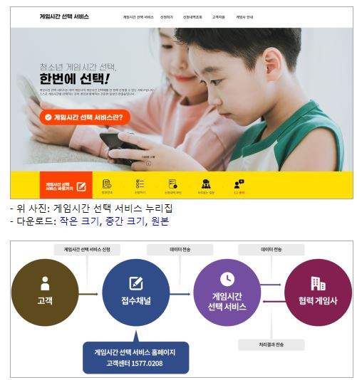 게임시간 선택 서비스 누리집을 통해 보호자와 청소년이 각각 본인인증을 한 후, 보호자를 통해 게임 이용시간을 선택하면 서비스 신청이 완료된다. 설정한 게임시간의 변경이 필요한 경우에도 동일한 절차로 진행해 게임 이용시간대를 조정할 수 있다.