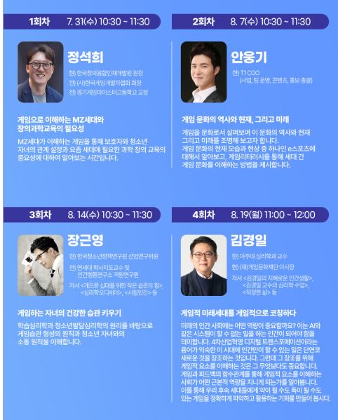 | 2회차는 8월 7일(수) 10시 30분부터 T1 안웅기 대표가 ‘게임 문화의 역사와 현재, 그리고 미래’를 주제로, 3회차는 8월 14일(수) 10시 30분부터 한국청소년정책연구원 장근영 선임연구위원이 ‘게임하는 자녀의 건강한 습관 키우기’를 주제로 한 강연이 이어진다.