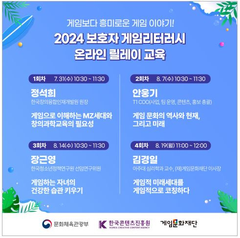 2024년 7월 29일 -- 게임문화재단(이하 재단, 이사장 김경일)은 문화체육관광부(장관 유인촌)와 한국콘텐츠진흥원(원장 조현래)과 함께 오는 7월 31일부터 ‘2024 보호자 게임리터러시 교육 - 게임보다 흥미로운 게임 이야기’ 온라인 릴레이 교육(이하 교육)을 실시한다고 밝혔다.