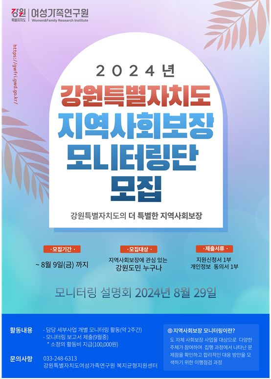 강원특별자치도여성가족연구원 복지균형지원센터,2024년 강원특별자치도 지역사회보장 모니터링단 모집한용택 기자 / |