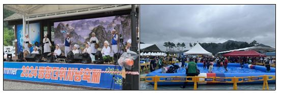 ....................................【주 요 행 사】..................................... □ Exciting Summer 2024 평창더위사냥축제 성황리에 진행중 ੦ 7. 26.(금) 막을 올린 2024 평창더위사냥축제에는 지난 주말 동안 많은 방문객이 축제장을 찾아 다양한 체험프로그램과 먹거리를 즐겼으며 특히 축제의 꽃이라고 할 수 있는 불꽃놀이를 관람하기 위해 많은 지역주민과 관광객들이 방문하였음. ੦ 지난(7.29.)에는 전통문화를 알리고 축제의 흥을 더하는 미탄아라리공연를 비롯, 필무용단, 평창드림밴드의 공연이 진행되어 방문객들의 큰 호응을 얻었음. ੦ 또한 궂은 날씨에도 불구하고 더위사냥축제위원회(위원장 최돈중) 주관의 안전점검과 많은 사회단체들의 봉사활동을 통하여 안전사고 발생이 없이 안전한 축제가 진행되고 있음. ੦ 오늘(7.30.) 주요 행사로는 지역 축제, 명소를 찾아 노래경연을 펼치는 태군노래자랑(방영: LG헬로비전 출연: 나태주, 박군) 촬영이 13:00~18:00 진행될 예정임.