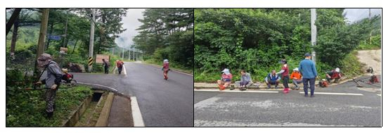 ....................................【미 담 사 례】..................................... □ 미탄면 평안2리 마을 제초작업 ੦ 지난(7.27.), 미탄면 평안2리(이장 김진환)에서는 마을주민들이 이른 새벽부터 마을환경개선을 위해 도로 주변 풀베기 제초 작업을 하였음.