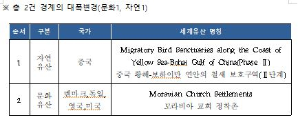 신규 등재 외에 유산의 경계가 크게 변경된 중국의 「황해-보하이만 연안의 철새 보호구역(Ⅱ단계)」과 덴마크와 독일 등 4개국의「모라비아 교회 정착촌」은 확장 등재되었다.