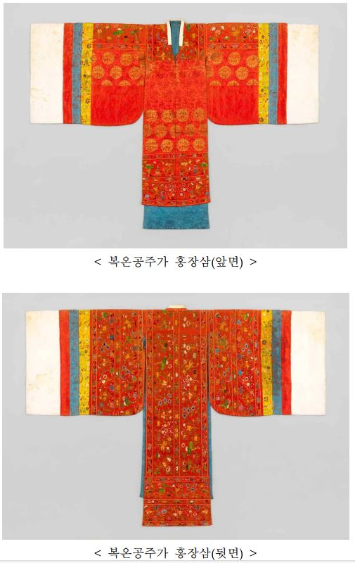 「복온공주가 홍장삼과 대대」는 조선 제23대 왕 순조(純祖)의 딸인 복온공주(福溫公主, 1818~1832)의 혼례복에서 유래한 유물로, 홍장삼은 앞과 뒤를 정교하고 아름다운 자수로 장식한 예복이고, 대대는 홍장삼을 착용할 때 가슴 부분에 두르는 폭이 좁고 긴 장식띠이다. 조선 왕실에서 홍장삼은 후궁과 공주·옹주(翁主), 왕자 부인이 혼례복으로 착용하였다.