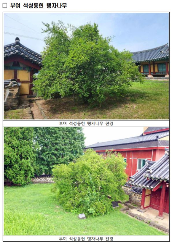 | 이번 「군산 하제마을 팽나무」와 「부여 석성동헌 탱자나무」는 오래된 자연물인 노거수가 갖는 역사적 가치를 비롯해 우리나라 고유의 생활·민속과 의 깊은 연관성, 우수한 규모와 아름다운 모양, 마을 주민들의 사랑을 받는 자연유산이라는 점을 종합적으로 고려하여 천연기념물로 지정 예고되었으며, 국가유산청은 앞으로 30일간의 예고기간 동안 의견을 수렴한 후 자연유산위원회의 심의를 거쳐 천연기념물로 지정할 예정이다.