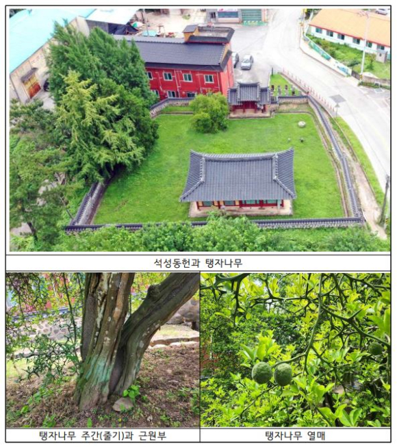 | 「부여 석성동헌 탱자나무」는 과거 부여 석성현에 소재했던 관아의 일부인 ‘석성동헌’(충청남도 유형문화유산)의 내삼문 오른쪽에 자리하고 있으며, 조선시대 지방 관아건물에 유일하게 남아있는 탱자나무 노거수이다.