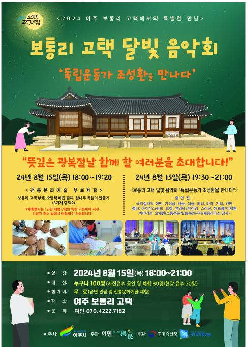 2024년 8월 9일 -- 여주시(시장 이충우)가 제79주년 광복절을 맞아 오는 8월 15일 오후 7시 30분 ‘보통리 고택 달빛음악회’(주최: 여주시, 주관: 문화감성예술단체 여민, 후원: 국가유산청, 경기도)를 개최한다.