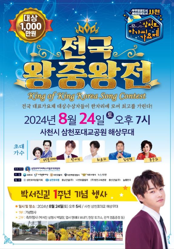 제12회 삼천포아가씨 가요제 박서진길 선포 1주년 기념행사와 동행오는 24일 저녁 7시 삼천포대교공원 해상무대에서 열린다이광훈 기자 / |