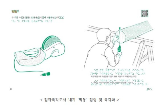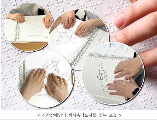 | 「그림으로 보는 전통건축 장인 대목의 도구」에는 탕개톱, 끌, 대패 등 우리나라 전통건축 장인이 사용한 41종의 도구 이름과 사용법이 담겼는데, 점자촉각도서에는 점자로 모든 내용을 설명하고, 직접 손끝으로 느낄 수 있도록 도구의 모양을 촉각 그림으로 수록하였다. 또한 정보무늬(QR코드)를 통해 장인이 직접 도구를 사용하며 설명하는 영상을 수어 해설과 함께 볼 수 있어 시각장애인뿐 아니라 청각장애인도 쉽게 이해할 수 있다.