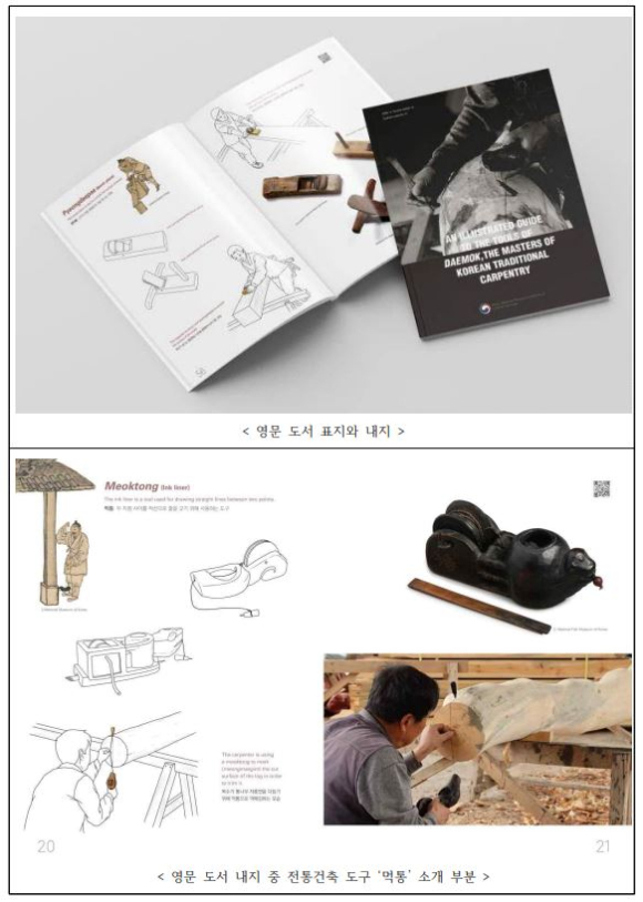 「An Illustrated Guide to the Tools of Daemok, the Masters of Korean Traditional Carpentry」라는 제목의 영문 도서에는 도구에 대한 설명을 국·영문 병기하고, 외국인도 이해하기 쉽도록 삽화와 과거 사진 자료, 실제 장인의 재현 모습을 함께 수록하였다. 아울러 정보무늬(QR코드)를 통해 도구 사용법과 관리법, 관련 일화 등에 대한 장인의 이야기도 영상으로 감상할 수 있도록 담았다. 국립완주문화유산연구소는 이 책자들이 널리 활용되어 언어와 장애의 장벽을 넘어 많은 사람이 우리 국가유산을 누릴 수 있는 기회가 확대되기를 기대한다.