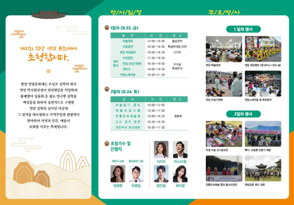 축제 첫날인 23일 오후 4시부터 특설무대 앞 하천에서 금호강 수중공연을 시작으로 연암 부임행차, 식전공연, 연암 안녕기원제에 이어 개막식, 그리고 초청가수 등이 함께하는 연암 노래자랑이 펼쳐진다.