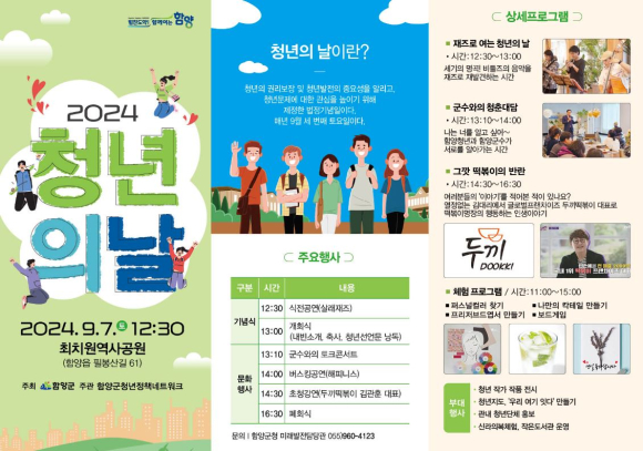 함양군, 오는 7일 ‘청년의 날 기념행사’ 개최최치원 역사공원서, 군수와의 청춘대담·두끼떡볶이 대표 강연·체험 프로그램 등 운영김도형 기자 / |