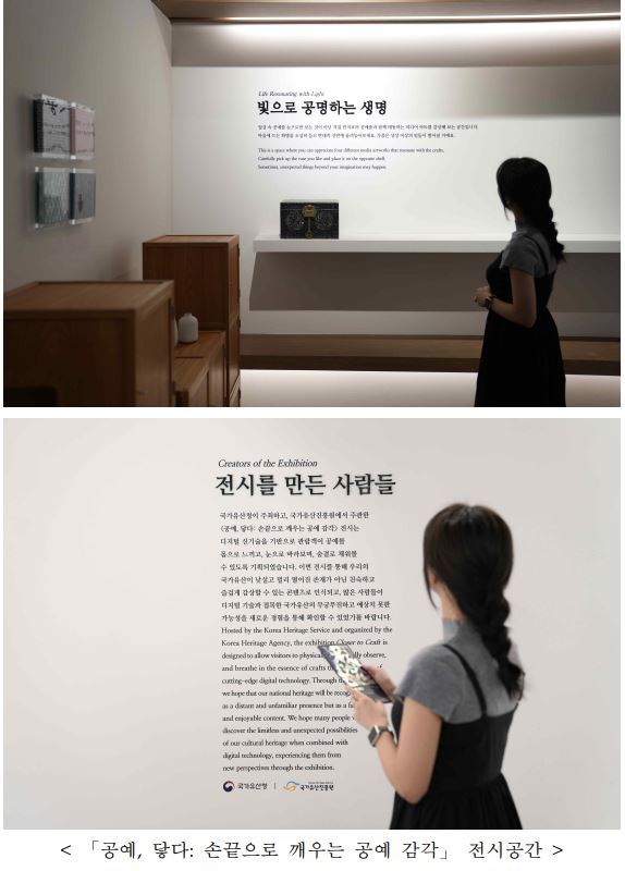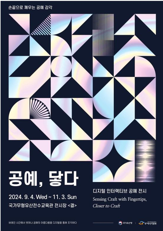 국가유산청(청장 최응천)은 국가유산진흥원(원장 최영창)과 9월 4일부터 11월 3일까지 국가무형유산전수교육관(서울 강남구) 2층 전시관 ‘결’에서 디지털 기술을 통한 전통 공예품 콘텐츠 전시 「공예, 닿다: 손끝으로 깨우는 공예 감각」을 개최한다.