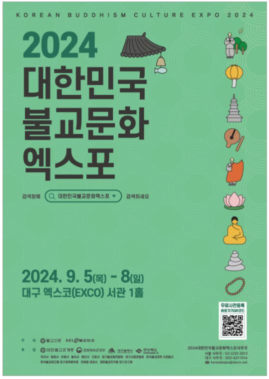 9월 5일~8일까지 대구 엑스코에서 ‘2024대한민국불교문화엑스포’ 개최 한국불교 중흥의 지속 가능한 발전 모색할 수 있는 다양한 프로그램 구성 전통불교문화의 가능성 증명할 수 있는 중요한 무대 될 것