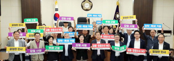 | 이와 함께 청렴 문구가 새겨진 팻말을 들고 추석 명절 기간 청렴 구호를 외치며 청렴 실천 분위기를 만들고 부패에 대한 경각심을 고취시켰다. 함양군의회는 이번 청렴교육을 시작으로 반부패·청렴문화 정착을 위해 지속적으로 노력할 계획이다. 김윤택 의장은“이번 청렴교육을 통해 직원들 스스로가 청렴 실천의지를 마음에 새기는 계기가 되길 바란다”며“공정하고 적극적인 직무수행을 통해 군민들이 신뢰할 수 있는 함양군의회가 되도록 노력하겠다”고 말했다. |