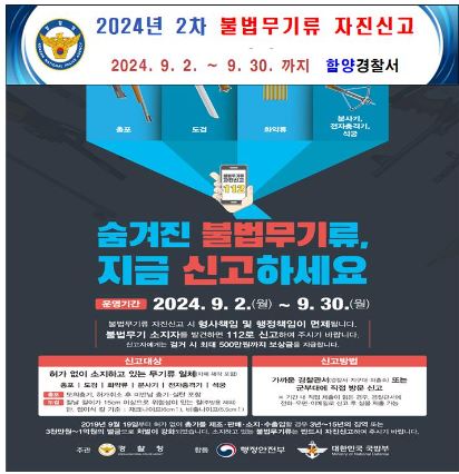 함양경찰 “9월 불법무기로 자진신고 하세요”적발 시 벌금 또는 15년 이하 징역이광훈 기자 / |