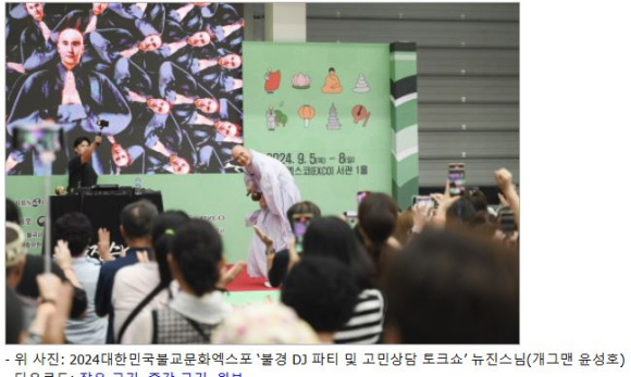 먼저 이번 ‘2024대한민국불교문화엑스포’ 공식 홍보대사이자 ‘힙(Hip)한 불교’의 태동을 알린 뉴진스님(개그맨 윤성호)의 ‘불경 DJ 파티’ 공연과 함께 ‘불교계 BTS’ 선명상 프로젝트 그룹 ‘비텐스(BUDDHA TEN SUNIM, BTENS)’와 부처님의 가르침을 현대적인 음악으로 전하고 있는 노래하는 관세음보살 ‘관서현보살(가수 서현진)’ 등의 무대가 펼쳐지며 엑스포의 열기를 고조시켰다. 특히 뉴진스님은 돈과 일, 연애, 인간관계 등 젊은 세대들이 겪을 수 있는 다양한 고민들을 함께 짚어보고, 새롭게 나아갈 수 있는 길을 알려주는 고민상담 토크쇼를 진행해 눈길을 끌었다.
