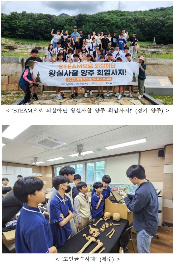 | 「국가유산 체험교실」은 국가유산 현장을 직접 방문하여 발굴 체험, 토기 제작 등의 체험 활동을 하는 프로그램으로, ‘탐라문화유산 선사탐험대-탐라를 꿈꾸다’(제주), ‘탐나는 청주’(충북 청주시) 등 9개 프로그램이 선정되었다. 「국가유산 방문학교」와 「국가유산 체험교실」이 결합된 형태로는 ‘무주의 문화유산 스토리 탐험대’(전북 무주군), ‘모두의 세계유산으로 피어나는 왕실사찰 양주 회암사지!’(경기 양주시) 등 3개 프로그램도 선정되었다. 「국가유산교육 교재개발 사업」에서는 ‘새롭게 만나는 우리 국가유산 시리즈 (자연유산 편)’(광주 남구), ‘문경 국가유산에서 찾는 우리의 미래-2080년의 너에게’(경북 문경시)의 2개 사업이 선정되었다. 국가유산청은 각 지역의 특성을 살린 현장체험 중심의 국가유산교육을 더욱 적극적으로 육성하여 지역 공동체와 문화 정체성을 강화하고, 이를 통해 우리 국가유산에 대한 올바른 인식과 가치관을 갖춘 미래세대를 양성하기 위한 적극행정을 지속적으로 이어갈 것이다.
