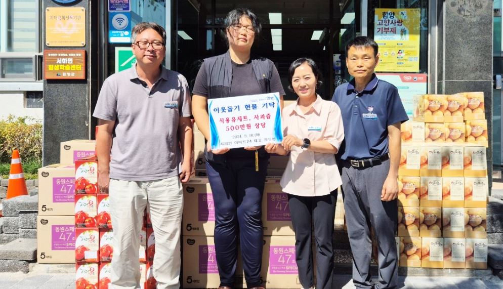 함양 서하면 정우현 씨, 이웃돕기 현물 기탁선물 세트와 사과즙 및 양파즙 등 500만 원 상당의 현물을 기탁안희진 기자 / |