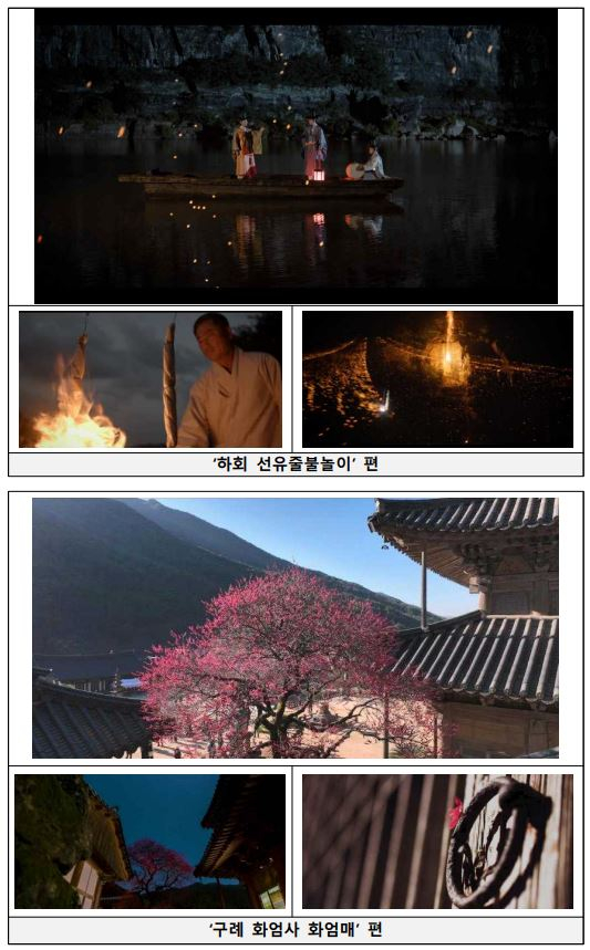 | KBS와 함께 제작한 「국가유산순례 ‘드오’」는 문화·자연·무형유산에 이르는 국가유산의 각 유형별 특징과 가치를 빼어난 영상미로 담아냈다. 이번에 선보이는 30편의 영상은 종묘 영녕전에서 KBS 국악관현악단의 연주와 함께한 <종묘제례악>, 풍류놀이의 절정이자 서애문집의 기록으로 남아있는 ‘선유줄불놀이’를 소리꾼 김준수의 소리와 함께 현대적으로 표현한 <하회 선유줄불놀이>, 모든 불빛을 차단하고 달빛으로만 촬영해 사찰과 어우러진 자연유산의 아름다움을 극대화한 <구례 화엄사 화엄매>, 풍요를 기원하는 초봄의 농심을 남사당놀이로 표현한 <순천 평촌리 이팝나무>, 선비의 고결함을 시조와 한량무로 풀어낸 <담양 소쇄원>, 조선시대의 강한 군사력과 왕권을 무예로 담은 <무예도보통지> 등 각각의 개별 주제를 가지고 있다. 전통연희와 가곡, 판소리 등 한국의 전통 선율을 영상의 배경음악으로 활용했기 때문에 전 세계 시청자들은 우리의 소리를 같이 음미하며 영상을 감상할 수 있어 더 신선한 감동을 받을 것으로 기대된다.