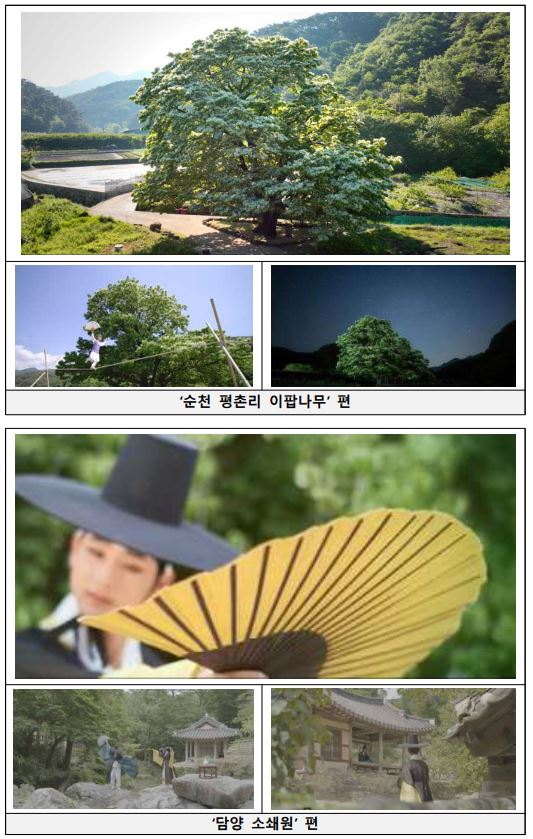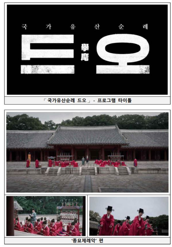나머지 영상들도 12월 15일(일)까지 KBS 1TV를 통해 매주 토·일요일 오후 8시 5분에 방영하며, 11월 중으로 유튜브 ‘국가유산채널’ 등을 통해 7개 국어 자막 서비스를 추가하여 국내외 시청자 누구나 쉽게 볼 수 있도록 서비스할 예정이다. * 드오: 종묘제향 때 음악의 시작을 알리는 신호로, 국가유산의 가치를 새롭게 알리고자 하는 의미를 담은 프로그램 명 * 추석 연휴기간 방영시간: (1편) 9.14.(토) 20:05 / (2편) 9.15.(일) 20:05 / (3편) 9.16.(월) 22:50 / (4편) 9.17.(화) 22:30 / (5편) 9.18.(수) 22:30