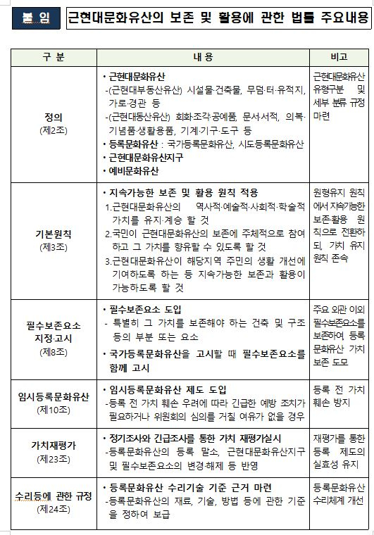 - ‘50년 미만’의 유산까지 보호 범위 확장, ‘근현대문화유산지구’ 지정해 ‘면 단위’ 보호 가능