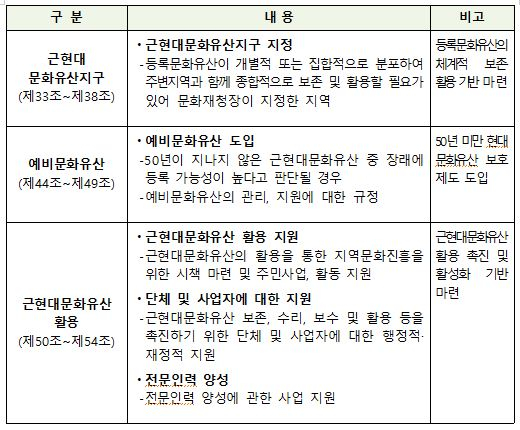 ① 근현대문화유산을 ‘개항기 전후부터 현재에 이르는 동안 형성된 문화유산 중 역사적·예술적·사회적 또는 학술적인 가치가 인정되어 특별히 보존할 필요가 있는 것’으로 정의하고, 등록문화유산·근현대문화유산지구 및 예비문화유산 제도 등 세부 분류 규정을 마련하였다.